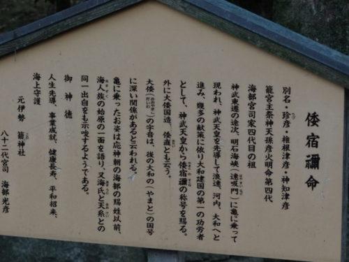 籠神社の4代目の祖先とされる倭宿禰命(やまとすくねのみこと)は、神武天皇の道案内をするために亀に乗って表れたという神話にとうじょうする。
