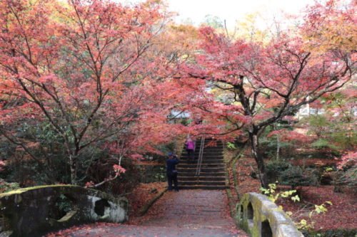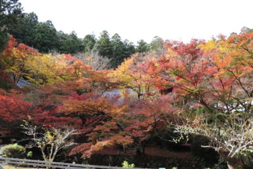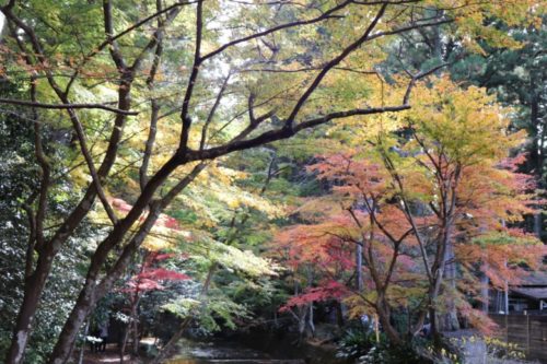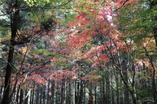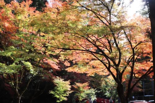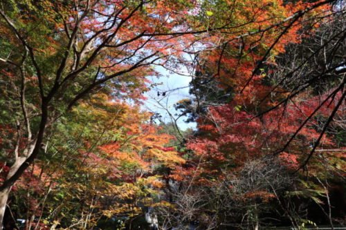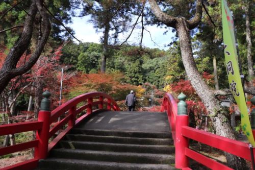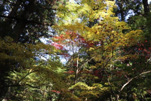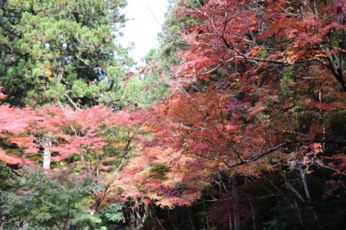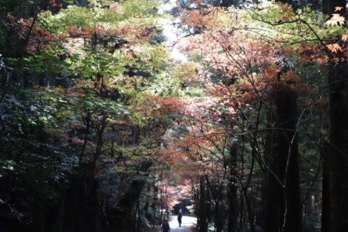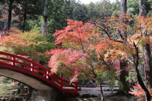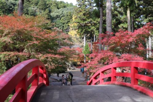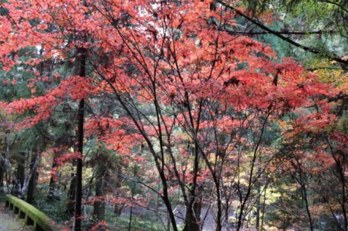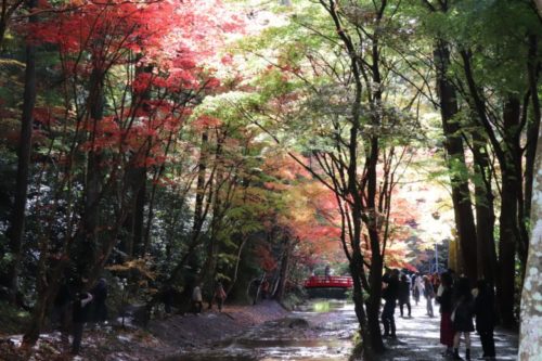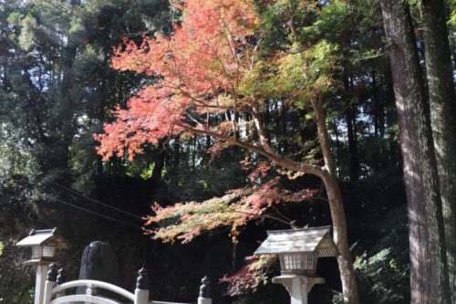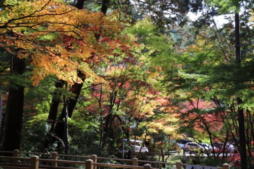 紅葉は神社の駐車場付近から神社東側の宮川の赤橋付近を中心に十分に進んでおりました。これから宮川の上流に向かって加速度的に進んで行くと思います。たくさんあった橋が、先だっての大雨で無くなっており、赤橋とその上あたりにもう一つぐらいしかありませんでした。そこは注意が必要だと思います。河原沿いの小道なども少なくなっています。