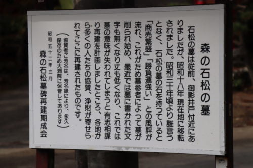 左が森の石松の墓で文字が刻んであるまわりが、かなり欠けていました。石松の墓のかけらを持っていると、商売繫盛とか勝負運に強いと言われています。欠いて持ち帰る人が多いため小さくなり、立て替えています。