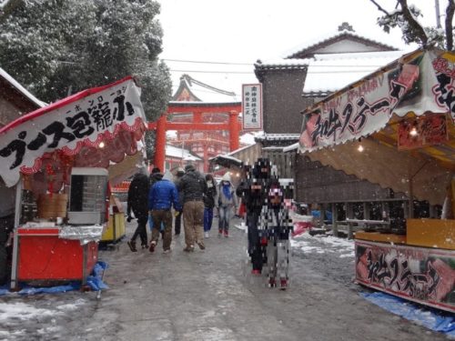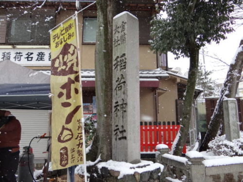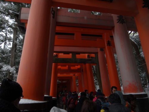 約5時間掛かって、大雪の中なんとか伏見稲荷にたどり着こうとしています。近くの駐車から参道を歩いて行きます。踏み後にはあまり雪はありません。