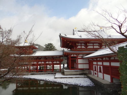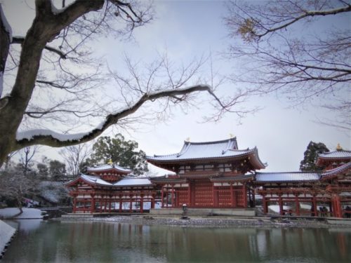 午前11時40分頃、伏見稲荷大社を後にして、世界遺産・平等院へと向かいます。10円硬貨のデザインにもなっている中心の建物「鳳凰堂」は、雪をまとった姿が息をのむほど美しいです。池に映り込む鳳凰堂と雪のコントラストは、まさに絵画のような絶景。屋根に立つ鳳凰像(一万円札のデザインにもなっています)も、雪の中で一層その神々しさを増しているように見えます。雪の平等院は、平安時代の貴族が夢見た極楽浄土を、より一層厳かで静謐な空間として感じさせてくれます。
