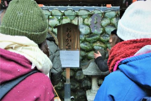 千本鳥居を抜けて奥の院の右奥に「 おもかる石 」があります。灯籠が2本あり、それぞれの灯籠の上におもかる石が乗っています。石燈籠の上に乗っている石を持った時、軽いと感じれば願いがかなうとされています。人気があり、若い女性の行列ができていました。雪の日に願掛けをするというのも、また特別な思い出になることでしょう。