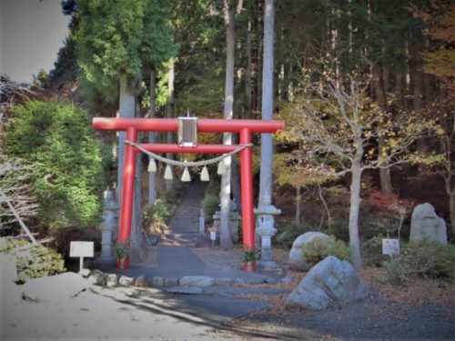 駐車場の脇に架かる橋を渡ると、立派な赤い鳥居が見えてきます。ここが石割山への登山口です。