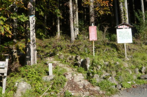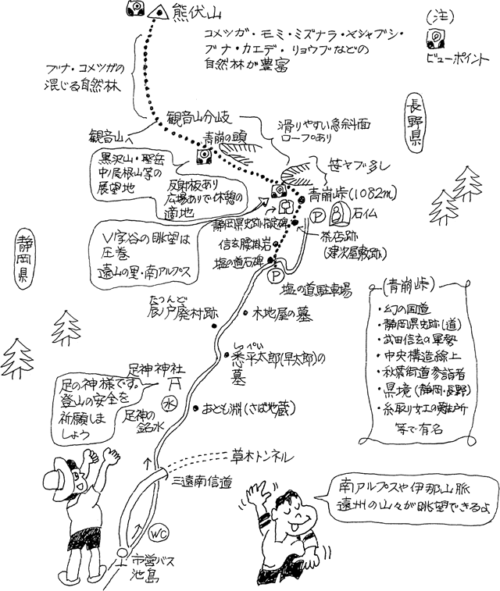 浜松市南区の自宅から車で約2時間 浜松市水窪町の塩の道青崩れ峠より長野県側に入った所にある熊伏山です。水窪から長野県側に向かい左側にあるのですが、国道150号線水窪市街を通り過ぎ、翁川橋の手前を右に入ります。ここを間違えなければ後は直進すれば、塩の道の石碑が有る駐車場に着きます。ここから信玄の腰掛岩茶店跡をすこし行けば青崩峠(1082m)の登山口です。