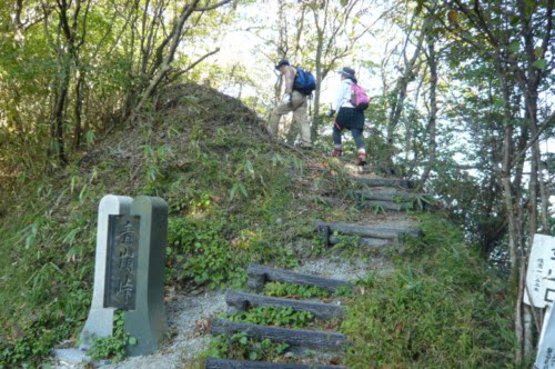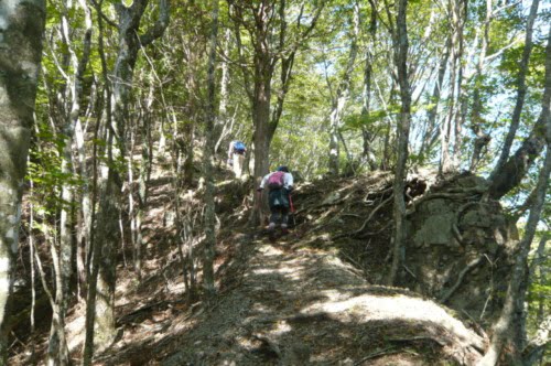 登り始めるとじきに、両側が崩れた、瘦せ尾根がありました。