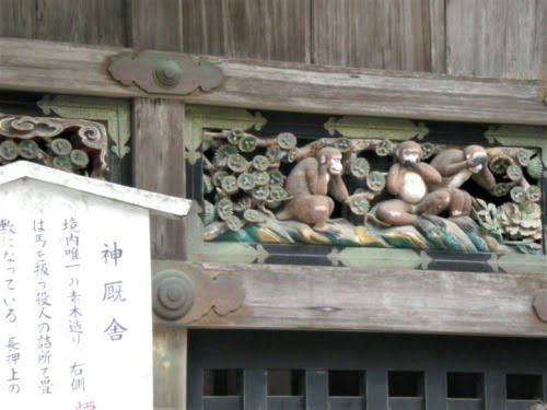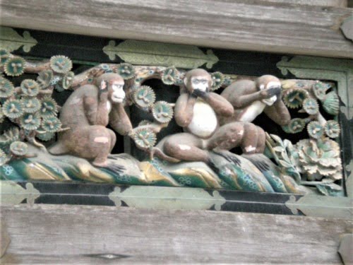 神厩舎の三猿 神馬(しんめ)の厩舎(きゅうしゃ)の神厩舎に16匹の猿が彫られていますが、そのうちの三猿の見ざる、言わざる、聞かざるのです。