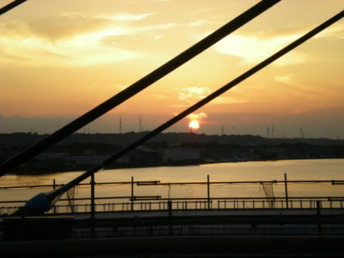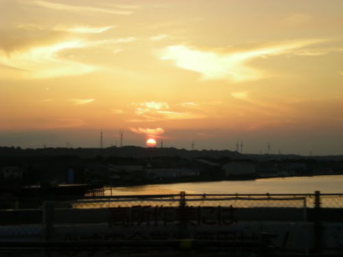 夕日を見ながら、利根川沿いに犬吠埼を目指します。