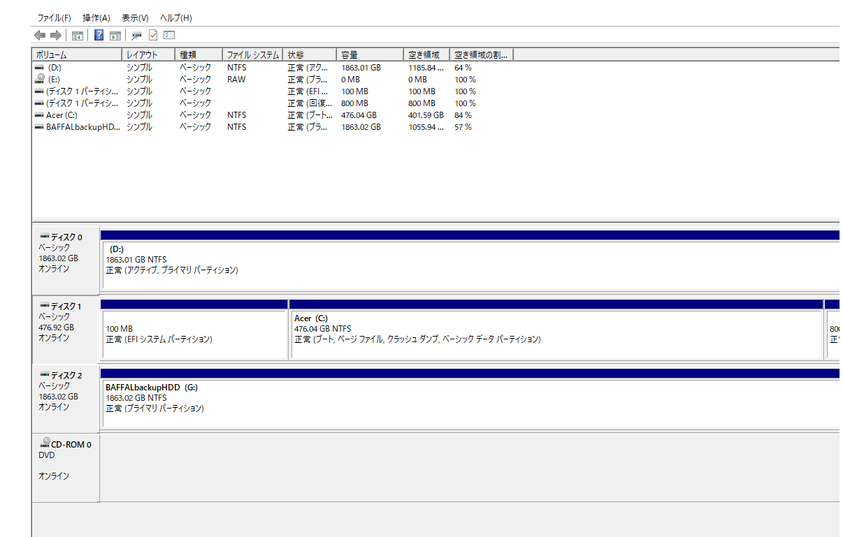 上記の絵はディストップPCのパーティションで、ディスク 0 がDドライブ、ディスク 1 が C ドライブになっています。ご覧のようにCドライブの前に100Mbのシステムパーティションがあります。このパーティションのサイズが余りにも小さいとエラーが発生します。