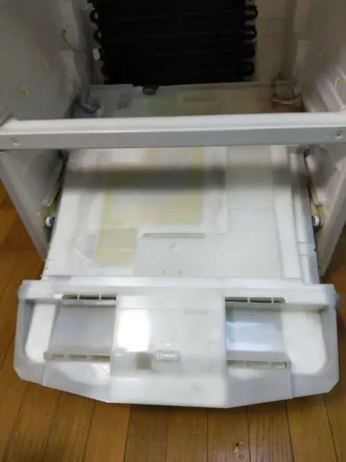 最下部の冷凍庫に氷が張っています。この氷が後ろから手前に押し出されて床に流れ出しています。