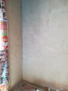 一回目は薄めに、道具は少し大きめのコテを使い練習がてら大雑把に塗りました。むらが目立っています。