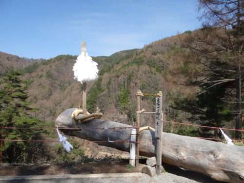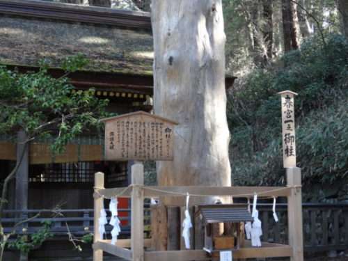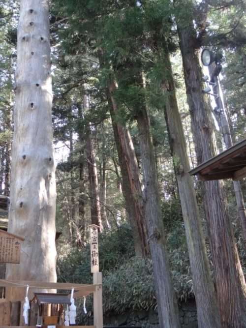 御柱(おんばしら)が立っています。御柱祭りで立てたものです。 御宝殿を中心に一の柱、二の柱と四本の御柱がっ立っています。
