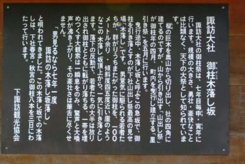 御柱祭は6年に(7年目に)一度、寅・申の年に行われる伝統的な神事です。諏訪大社の宝殿を作り直し、樅(もみ)の巨木を切り出し、周辺6市町村の約20万人の氏子が参加して社殿の4隅にある御柱を建て替える大イベントです。そのさいに、この御柱木落坂を引き落とすさまは正に圧巻です。けが人多数、時々死者まで出ると言う凄さです。