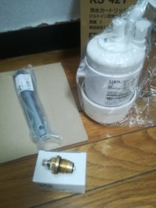 浄水カートリッジ交換も済ませ、締めておいた元栓を緩め、水漏れが無いか確認します。INAXの品番はKS-42Y しばらく前までは、色んな所で販売されていましたが、偽物が横行したためか現在はリクシルの直販サイトでしか注文できなくなっています。
