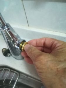 コックの横の小さな窪みにマイナスドライバーを差し込み、カバーを外します。